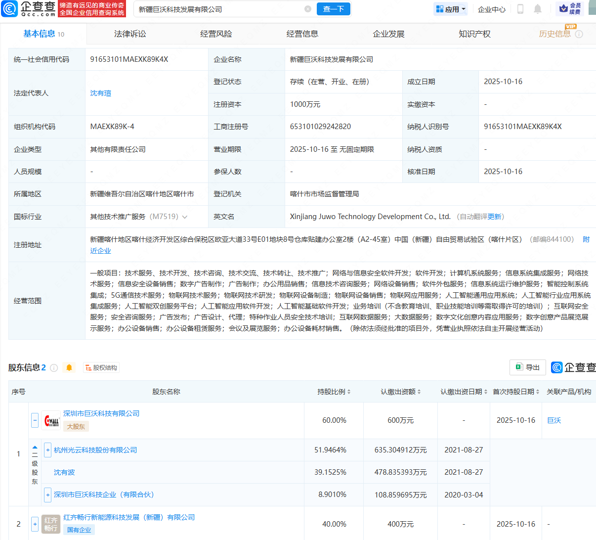 光云科技等在新疆成立科技发展公司,含AI相关业务