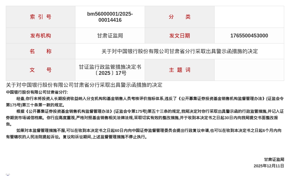甘肃银行甘肃省分行被出具警示函,涉投资人长期投资收益未纳入考核