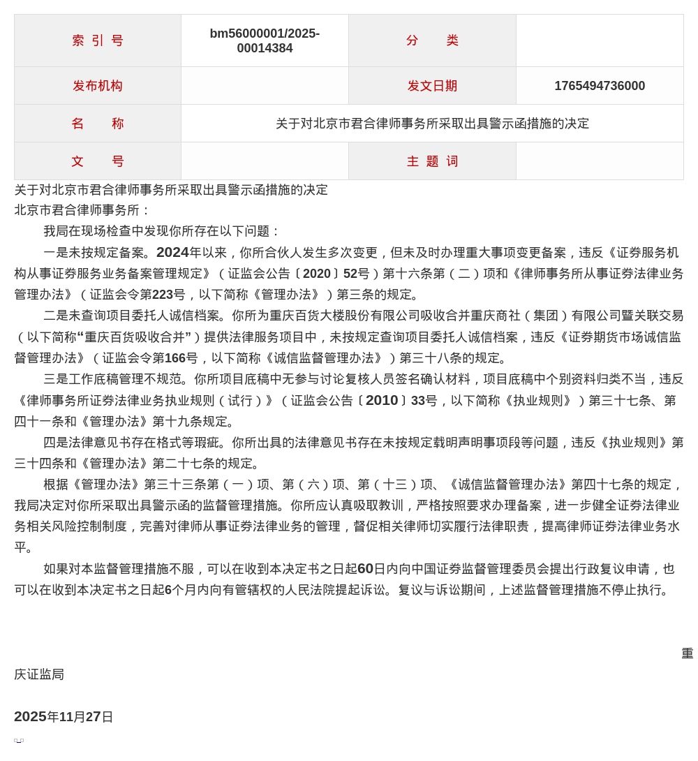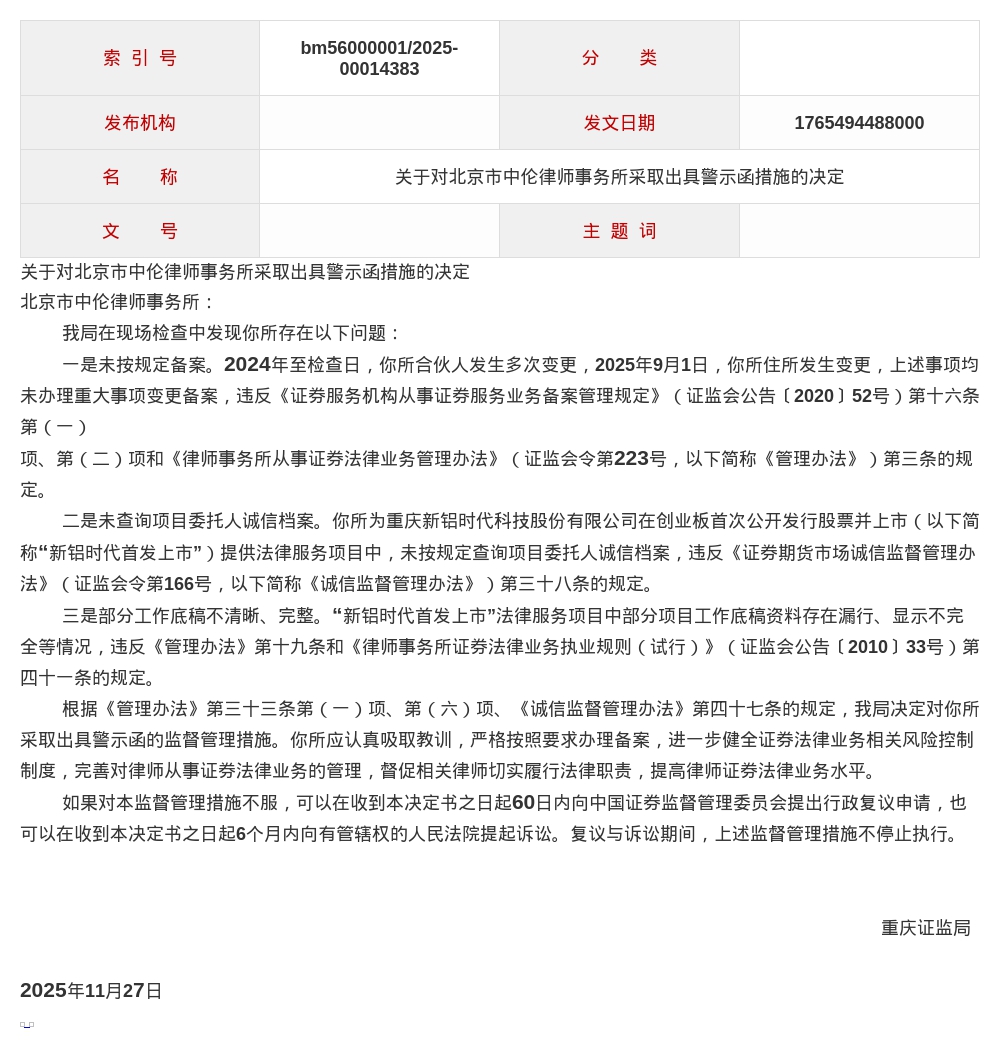 北京中伦律所被出具警示函,涉未备案等违规行为