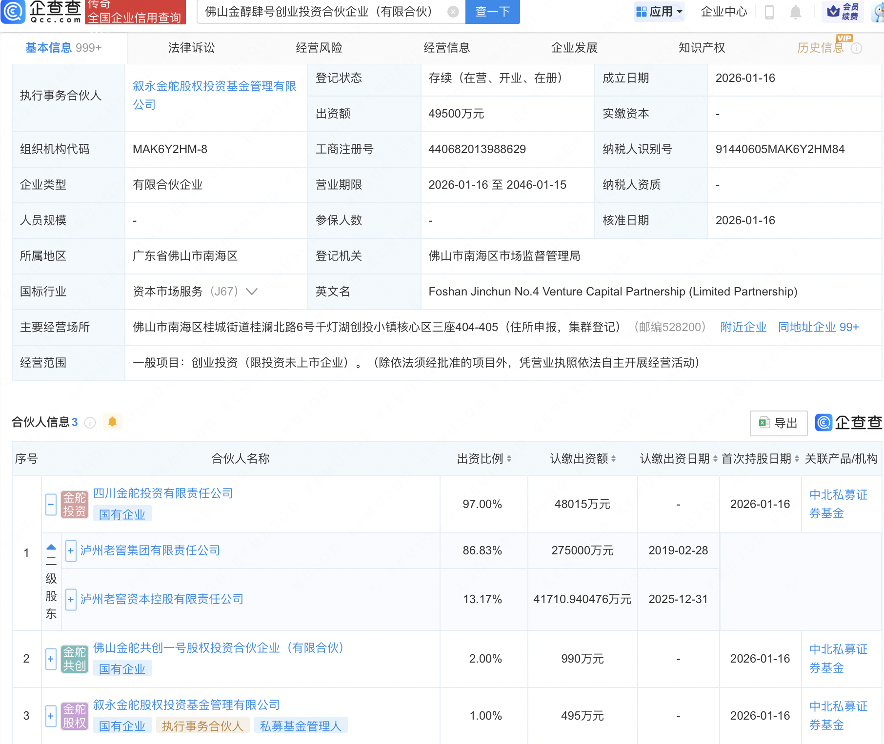 泸州老窖等新设创投合伙企业,出资额4.95亿