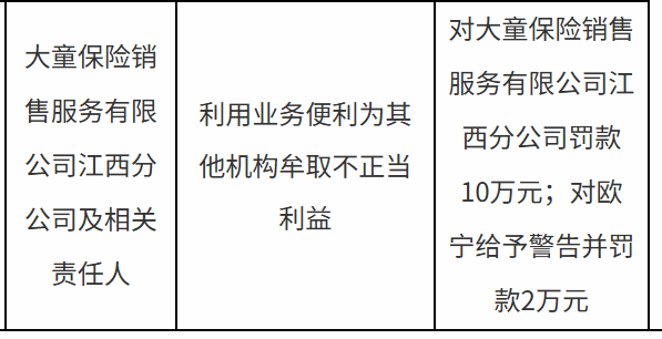 大童保险江西分公司被罚10万,涉利用业务便利为其他机构牟取不正当利益