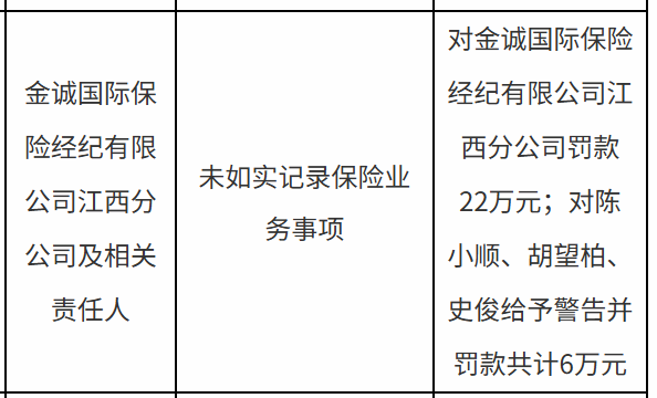 金诚国际保险江西分公司被罚22万,涉未如实记录保险业务事项