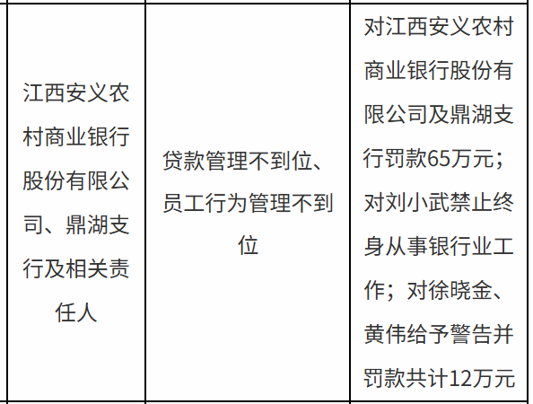 江西安义农商行、鼎湖支行被罚65万,涉贷款管理不到位等