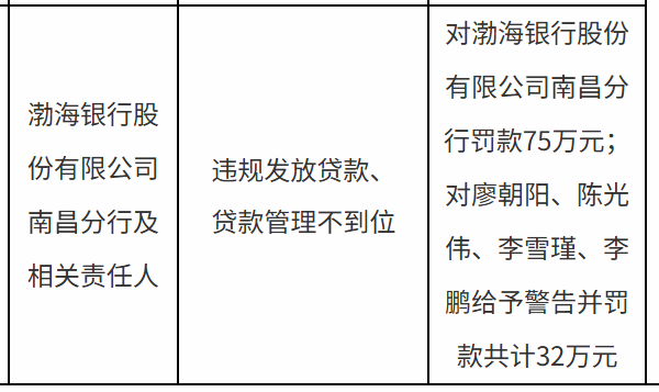渤海银行南昌分行被罚75万,责任人共被罚32万