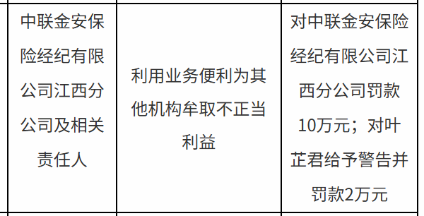 中联金安保险江西分公司被罚10万,涉利用业务便利为其他机构牟取不正当利益