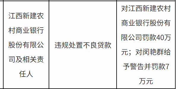 江西新建农商行被罚40万,涉违规处置不良贷款