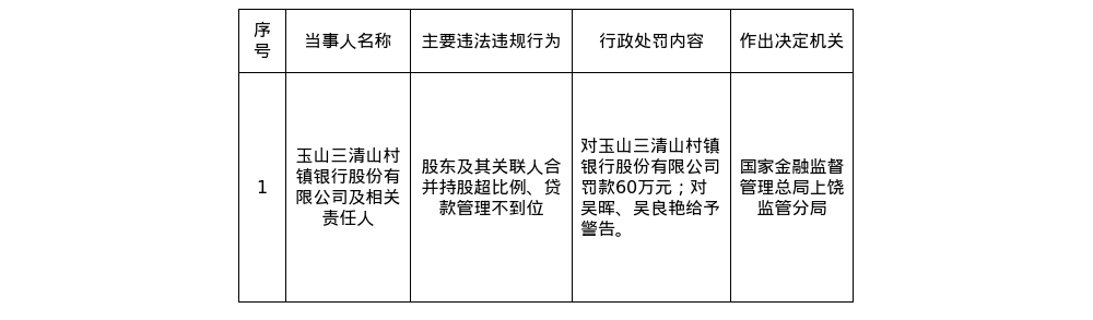 玉山三清山村镇银行被罚60万,涉贷款管理不到位等