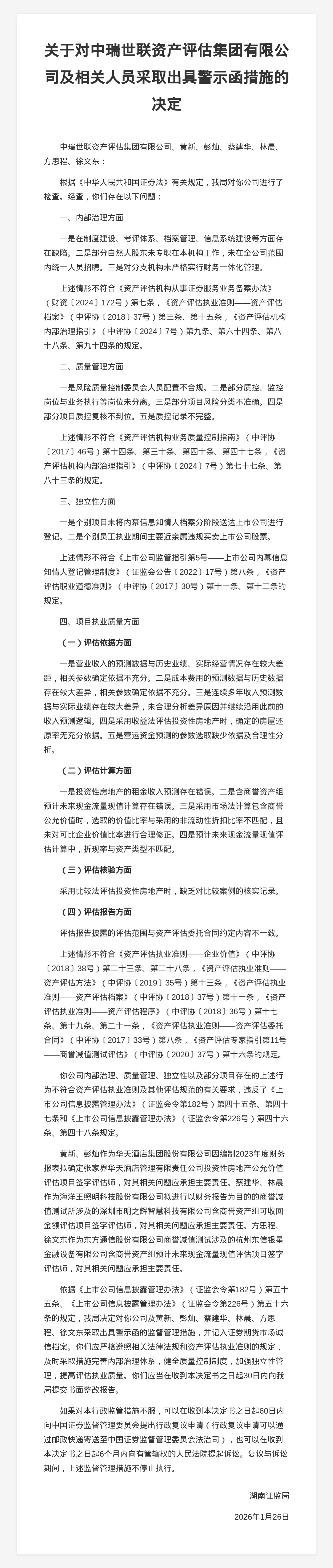 中瑞世联资产评估集团被出具警示函,涉内部治理等问题