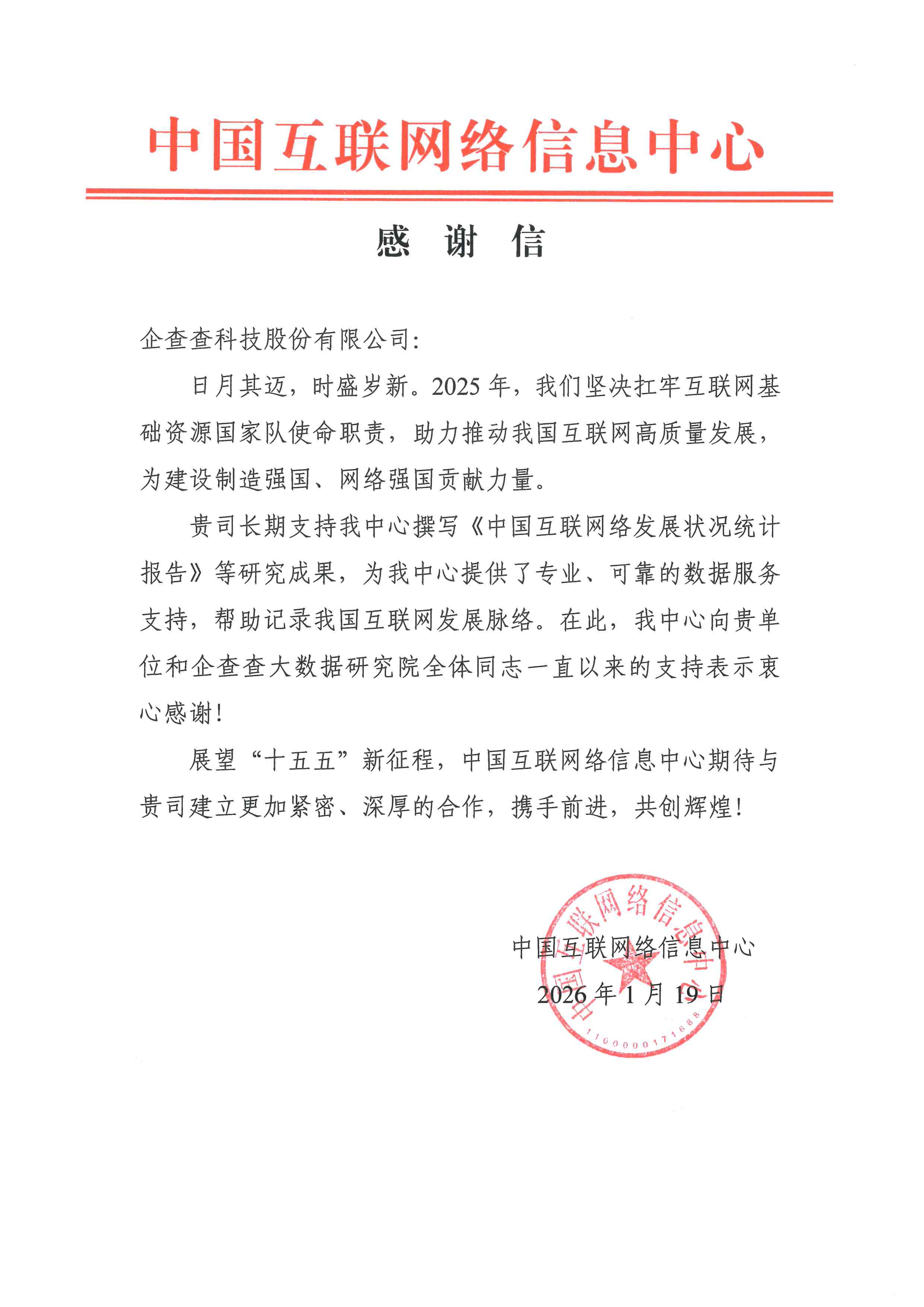 专业数据获认可:企查查大数据研究院获中国互联网络信息中心感谢信