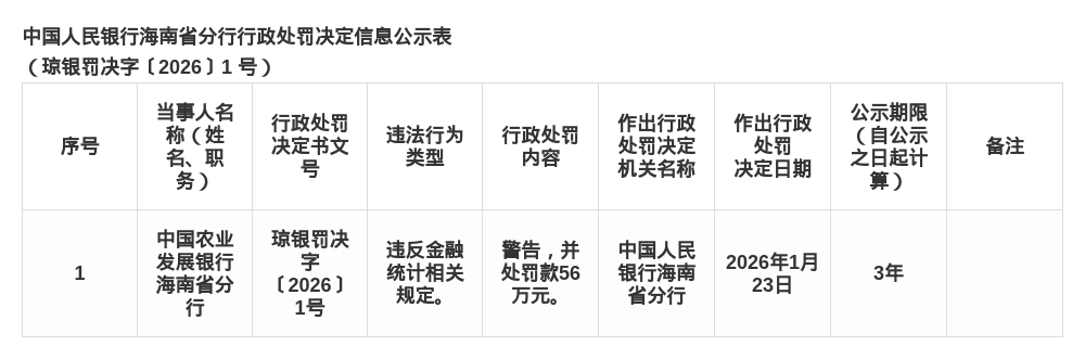 农发行海南省分行被罚56万,涉违反金融统计规定