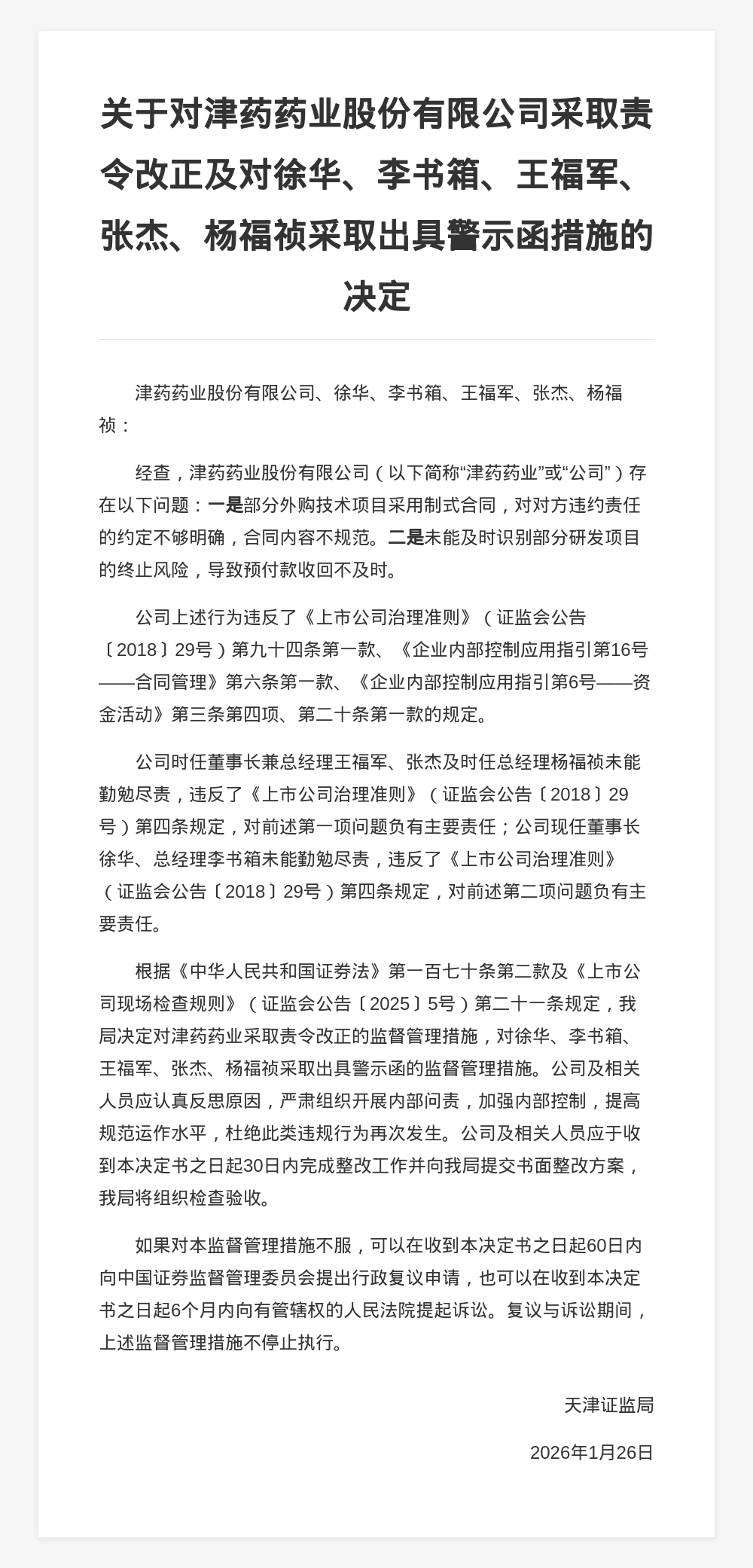 津药药业被责令改正,高管被出具警示函,涉合同内容不规范等