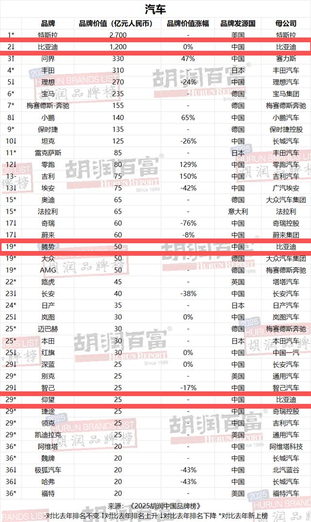 比亚迪连续四年蝉联《胡润汽车品牌榜》中国汽车品牌第一名