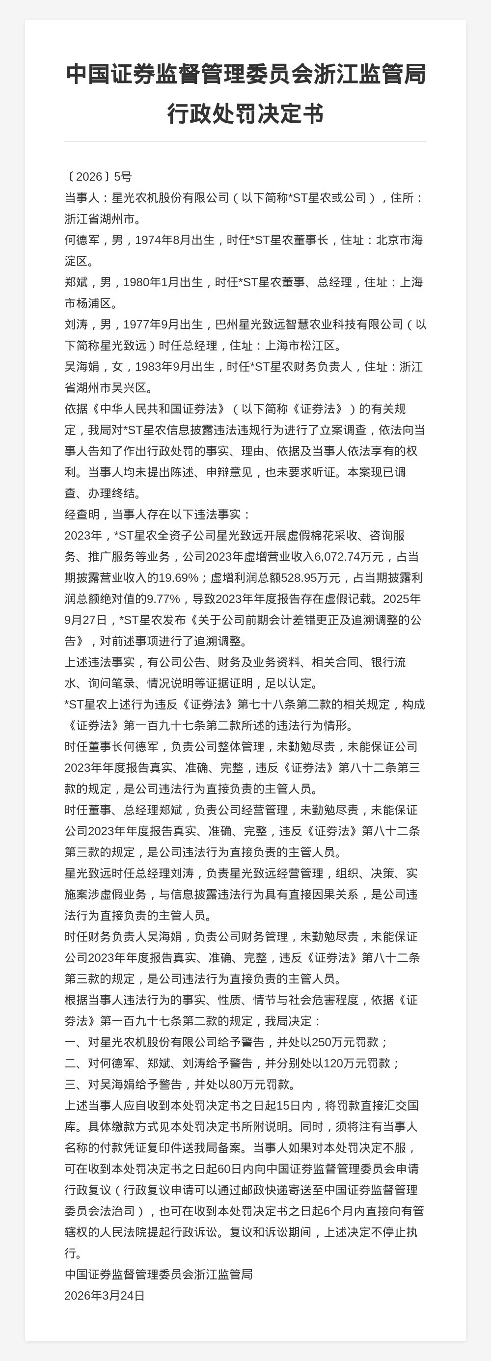 星光农机被罚250万,责任人共被罚440万,涉年报虚假记载