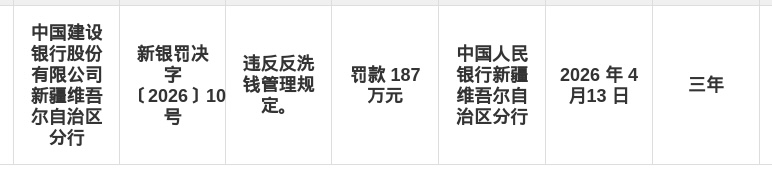 建行新疆维吾尔自治区分行被罚187万,涉违反反洗钱管理规定