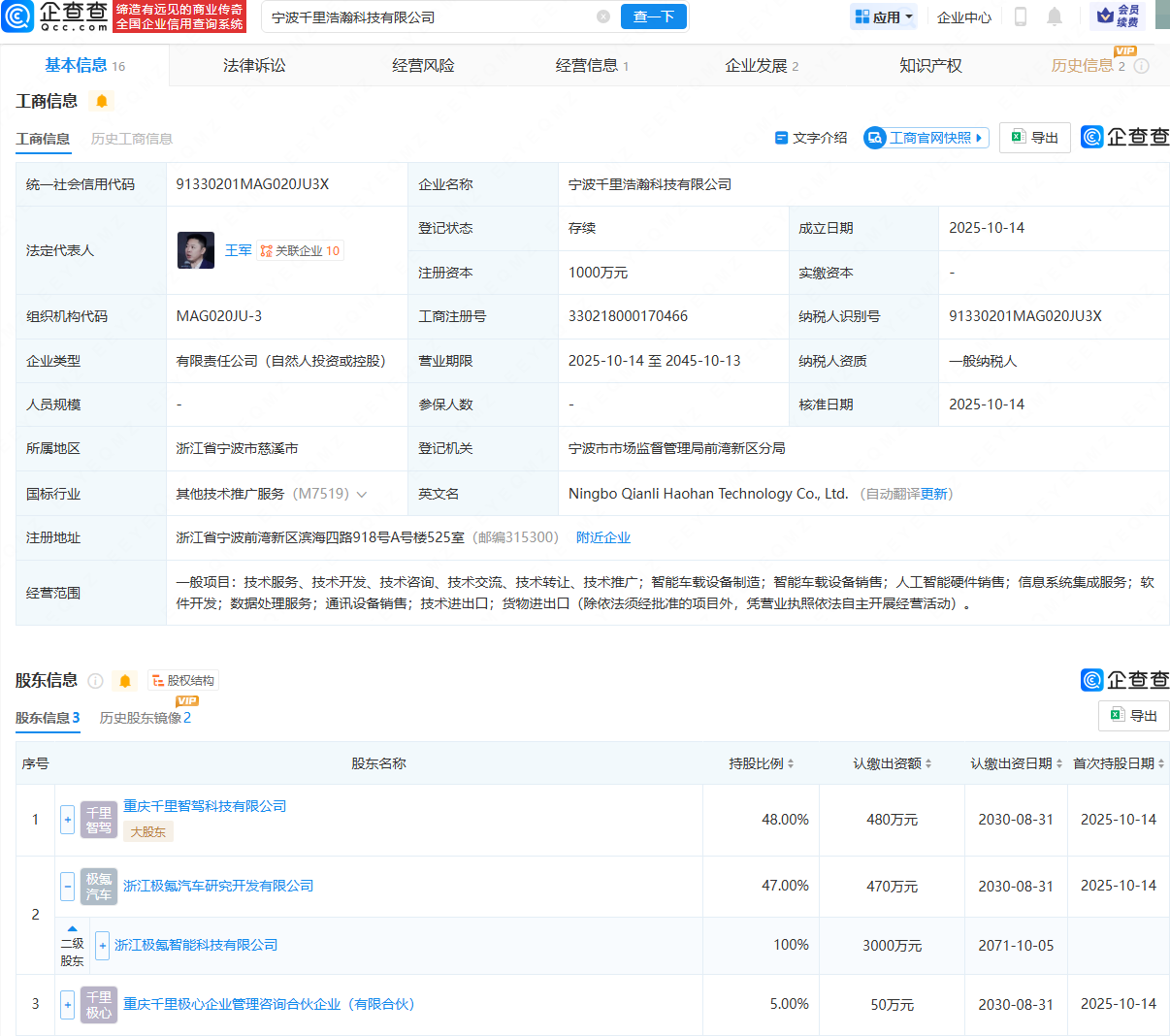 极氪汽车等在宁波成立千里浩瀚科技公司