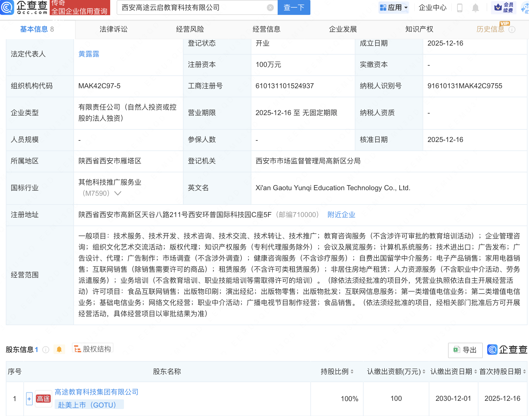 高途在西安成立教育科技新公司