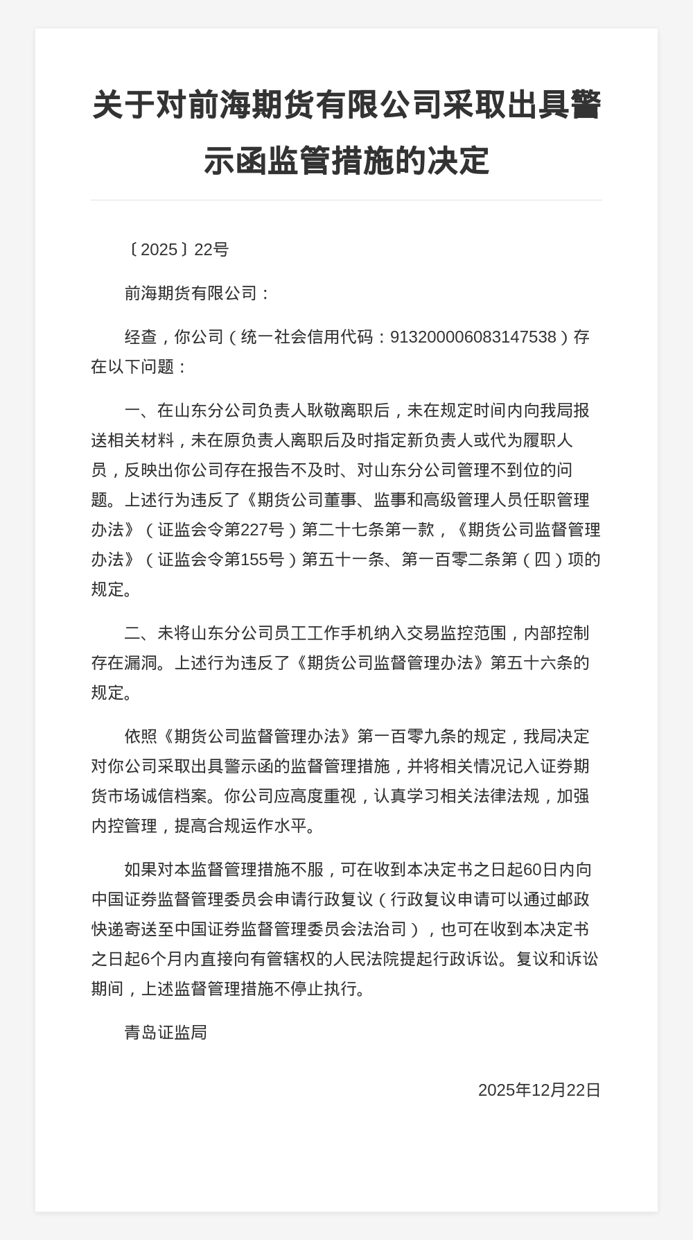 前海期货被出具警示函,涉报告不及时等